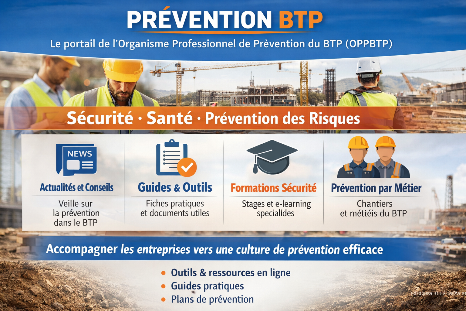 L’OPPBTP agit comme réseau de prévention spécialisé pour le BTP, composé d’experts issus du terrain, avec pour mission de sensibiliser, accompagner et former les professionnels afin de réduire les accidents et les maladies liées au travail et d’améliorer les conditions de travail.